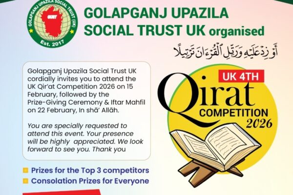 যুক্তরাজ্যে বসবাসরত বাংলাদেশি শিশুদের অংশগ্রহণে ৪র্থবারের মতো ক্বিরাত প্রতিযোগিতার আয়োজন করেছে গোলাপগঞ্জ উপজেলা সোশ্যাল ট্রাস্ট ইউকে। আগামী ১৫ ফেব্রুয়ারি (রবিবার) সকাল সাড়ে ১০টায় লন্ডনের চিলড্রেন এডুকেশন সেন্টারে প্রতিযোগিতার প্রথম পর্ব অনুষ্ঠিত হবে। এতে যুক্তরাজ্যে বসবাসরত ৫ থেকে ১৬ বছর বয়সী বাংলাদেশি বালকরা অংশগ্রহণ করতে পারবে। আগামী ২২ ফেব্রুয়ারি দুপুর ২টায়...