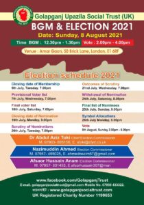 গোলাপগঞ্জ উপজেলা সোশ্যাল ট্রাস্ট (ইউকে)- এর বোর্ড অব ম্যানেজমেন্ট কমিটির নির্বাচন আগামী ৮আগষ্ট ২০২১, রবিবার; Amar Gaon, 50 Brick Lane, London, E1 6RF এ ঠিকানায় অনুষ্ঠিত হবে।