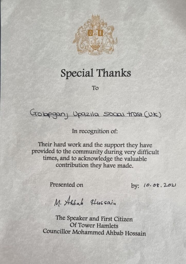 টাওয়ার হ্যামলেটস কাউন্সিলের স্পিকার কাউন্সিলার আহবাব হোসেন গোলাপগঞ্জ উপজেলা সোশ্যাল ট্রাস্ট – কে কমিউনিটির কাজের স্বীকৃতি জন্য টাওয়ার হ্যামলেটস কাউন্সিলের পক্ষ থেকে রিকোনাইজেশন সার্টিফিকেট প্রদান করেন।