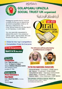 যুক্তরাজ্যে বসবাসরত বাংলাদেশি শিশুদের অংশগ্রহণে ৪র্থবারের মতো ক্বিরাত প্রতিযোগিতার আয়োজন করেছে গোলাপগঞ্জ উপজেলা সোশ্যাল ট্রাস্ট ইউকে।